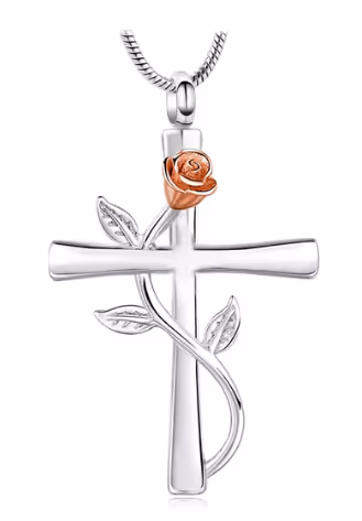 Rose Flower with Stem and Leaves Pendant (Pink-Silver)